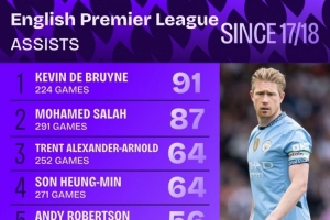 17-18赛季以来英超助攻榜:德布劳内91助居首,萨拉赫87助次席