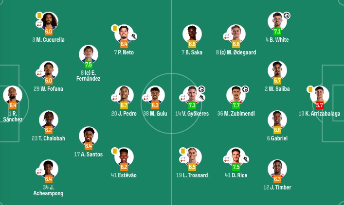切尔西首发:1-罗伯特-桑切斯、34-阿奇姆彭(53'5-巴迪亚希勒)、29-韦斯利-福法纳(75'21-哈托)、23-特雷沃-查洛巴、3-库库雷利亚(81'4-阿达拉比奥约)、17-桑托斯、8-恩佐、41-埃斯特旺、7-内托、20-若昂-佩德罗(81'62-姆厄卡)、38-吉乌(53'49-加纳乔)